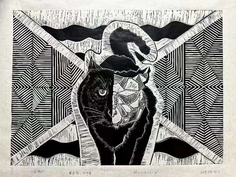 白沛霭(白蓉)和魏晨杨两位同学用设计语言结合凸版印刷的工艺手法做了一个以黑猫为主题的画面。画面结合了写实和构成的手法,形成了直线与曲线的对比,再加上背景强烈的装饰语言参与了整体构图,画面表达明快清晰,是设计与手工印刷结合的比较好的一副作品。