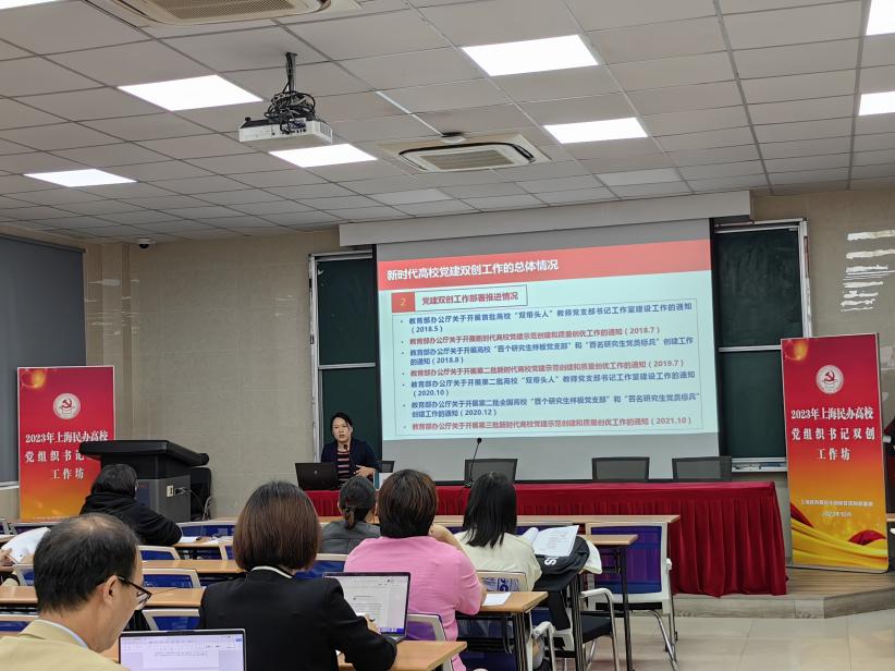 为深入学习宣传贯彻党的二十大精神,经市民办高校党工委研究,依托上海民办高校干部和党员研修基地举办“2023年上海民办高校党组织书记双创工作坊”。来自上海各民办高校党组织书记共计30人参加为期3天的专题研修。10月21日下午,英国正版365首页党总支书记戴红梅受邀为“双创工作坊”做题为“民办高校党建‘双创’重点与特色”的专题讲座。