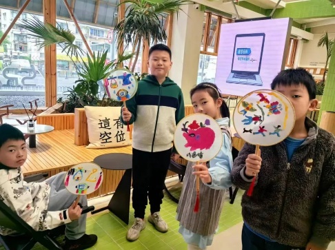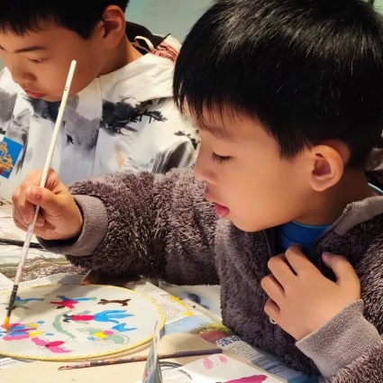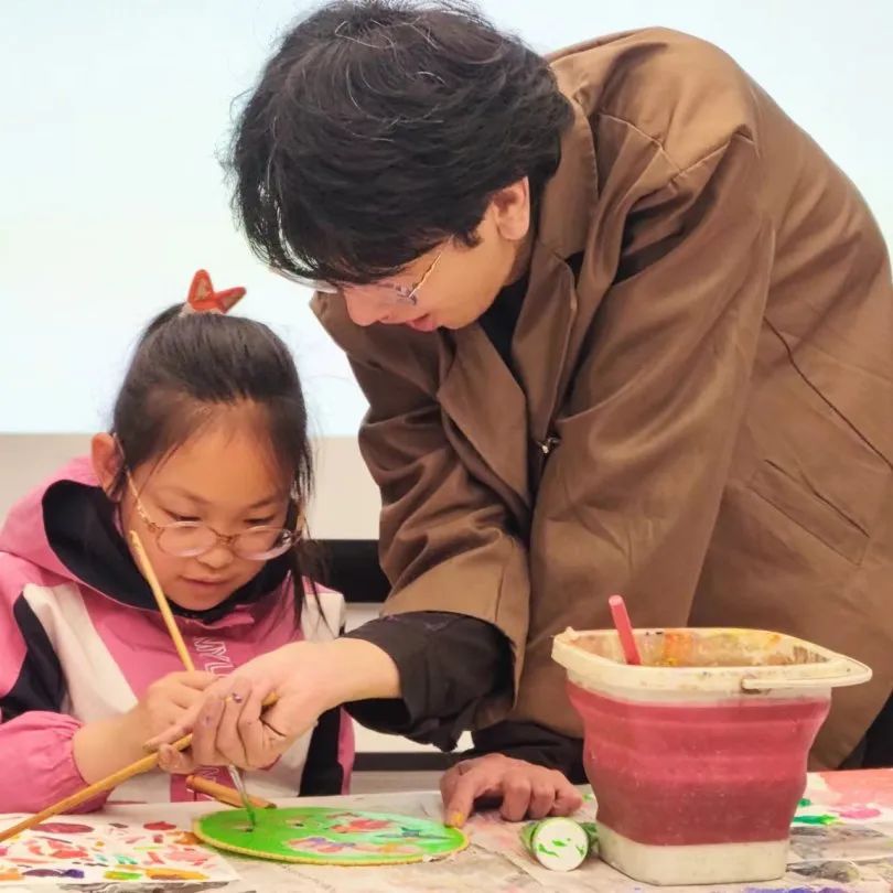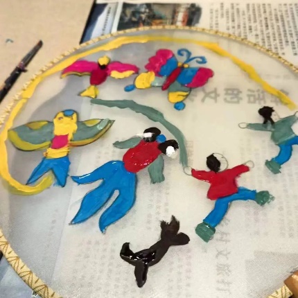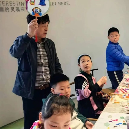 在互动创作环节上,为了让小朋友们更好地绘制金山农民画团扇,朱希教授先用PPT把传统非遗金山农民画进行展示讲解,也通过实物原作让同学们近距离欣赏,三位助教老师也从旁耐心的指导,让每个小朋友都亲身体验作画的快乐过程。活动中,学生们对金山农民画兴趣浓厚,对画面中出现的许多场景、人物、风俗、道具等充满好奇,纷纷踊跃举手提问。授课结束后同学们意犹未尽,主动要求与朱老师和助教们合影留念,同时表示要把自己创作的金山农民画团扇倍加珍藏。