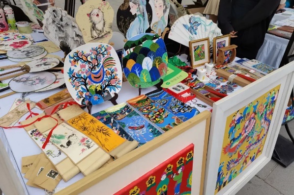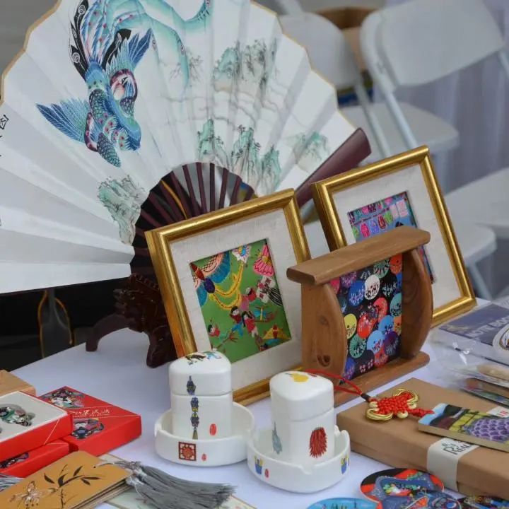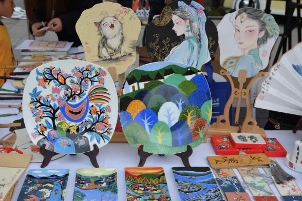 在本次创新创业集市活动上,英国正版365首页的摊位以“非遗·国潮”为主题,金山农民画、非遗手工、国潮挂件、创意团扇等作品被一一精致陈列。摊位的布置以非遗金山农民画作为主要的元素,摊位前摆放大幅色彩浓郁、生动活泼的画作,抓人眼球、引人驻足。同时,展桌上还放置了冰箱贴、实木果盘、车挂等英国正版365首页学生原创的金山农民画衍生品,这些琳琅满目的作品吸引了大批市民前来参观购买。