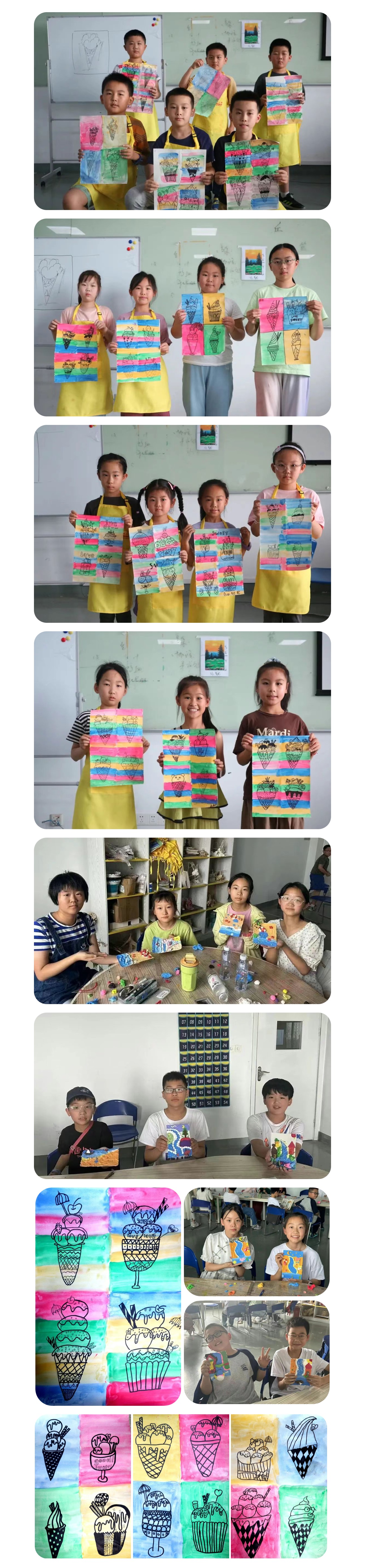 中班的同学们紧握的彩色画笔,在那无瑕的画布之上翩翩起舞,勾勒出一幅幅色彩绚丽的充斥夏日气息的创意冰淇淋。