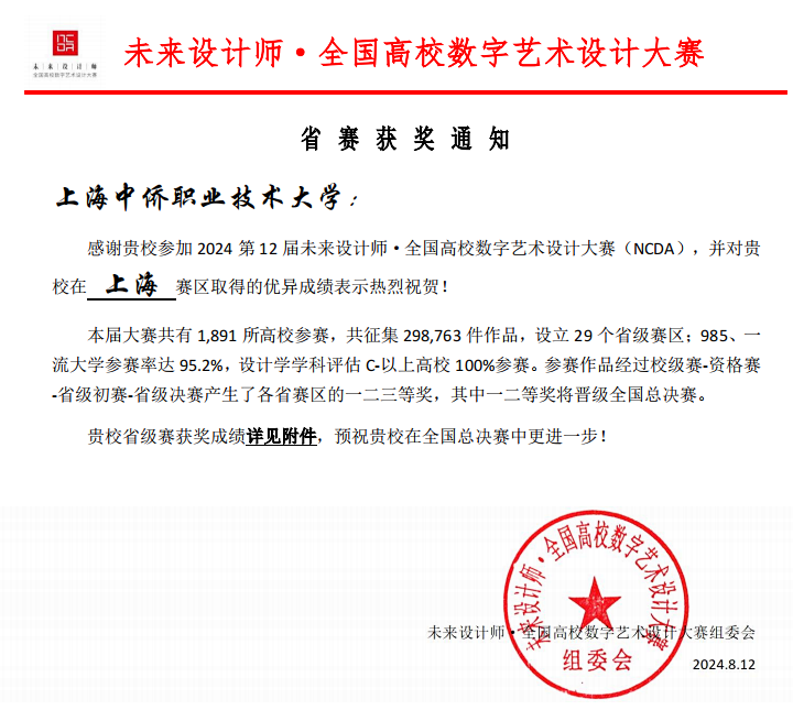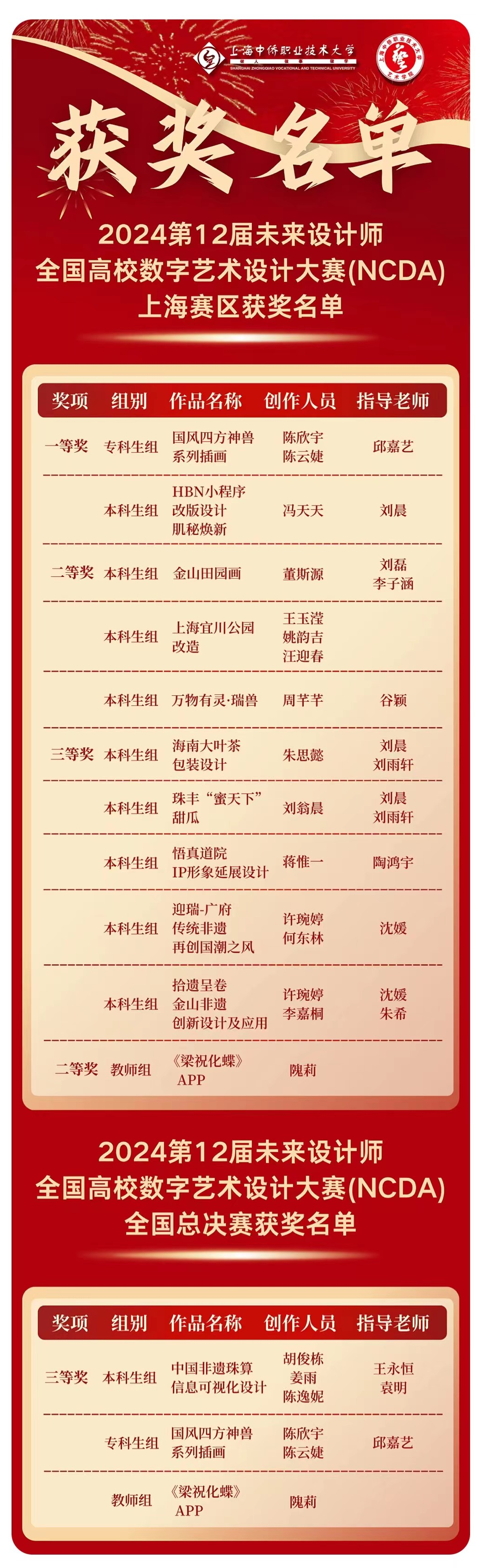 经过紧张的评审,统计,汇总,作品公示等工作,2024第12届未来设计师NCDA大赛上海赛区和全国总决赛已全部结束,按照作品得分高低分别决出一、二、三等奖。本届大赛共有1,891所高校参赛,共征集298,763件作品,设立29个省级赛区;985、一流大学参赛率达95.2%,设计学学科评估C-以上高校100%参赛。英国正版365首页在上海赛区中获奖11项,一等奖2项、二等奖4项、三等奖5项,其中教师获奖1项,学生获奖10项;全国总决赛中获三等奖2项其中英国正版365首页教师组1项,英国正版365首页学生组1项。