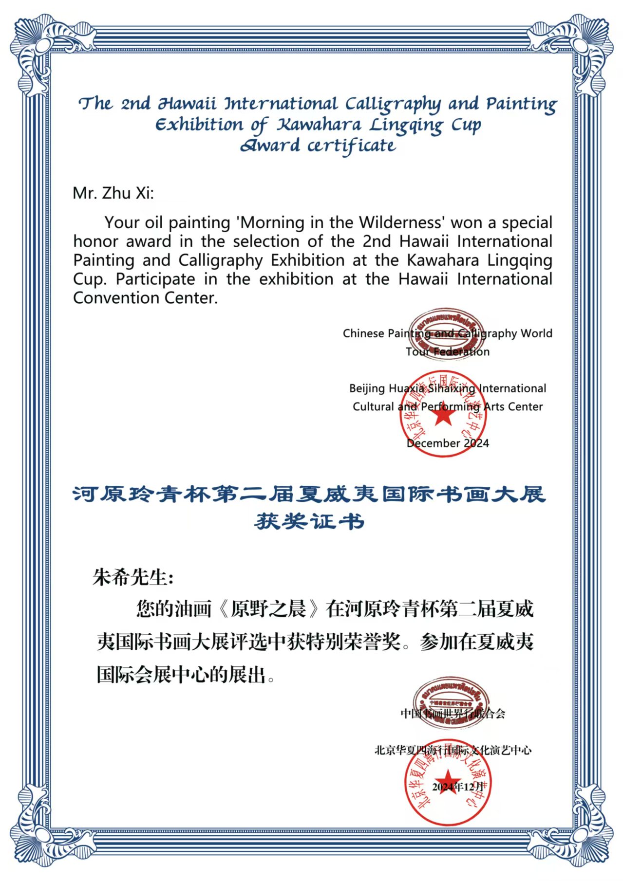 在国际艺术交流舞台上,近年来朱希教授的影响力远不止于欧洲。在第二届夏威夷国际书画大展活动中,朱希教授同样展现出非凡的实力。他带去的油画作品《原野之晨》,以其行云流水般的笔法、深邃悠远的文化内涵,以及独特的个人风格,在众多参展作品中脱颖而出,荣获"特别荣誉奖",被夏威夷国际艺术与经济合作组织、夏威夷中国日报书画鉴藏编委会、中国书画世界行组委会共同授予“首届中美文化交流优秀使者”称号荣誉。为中美文化的交流又作出了重大贡献。